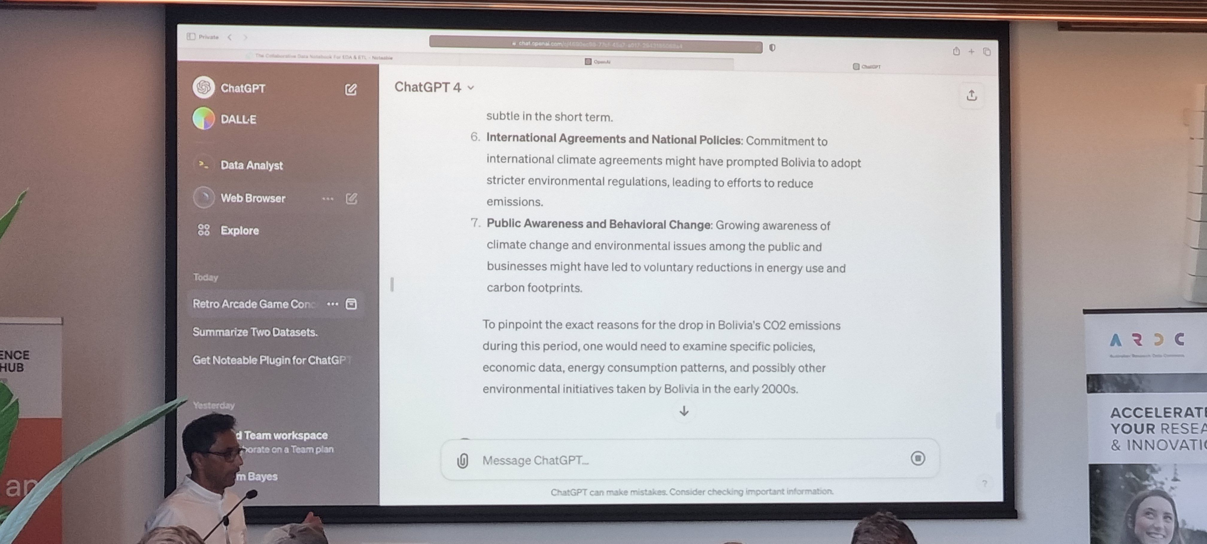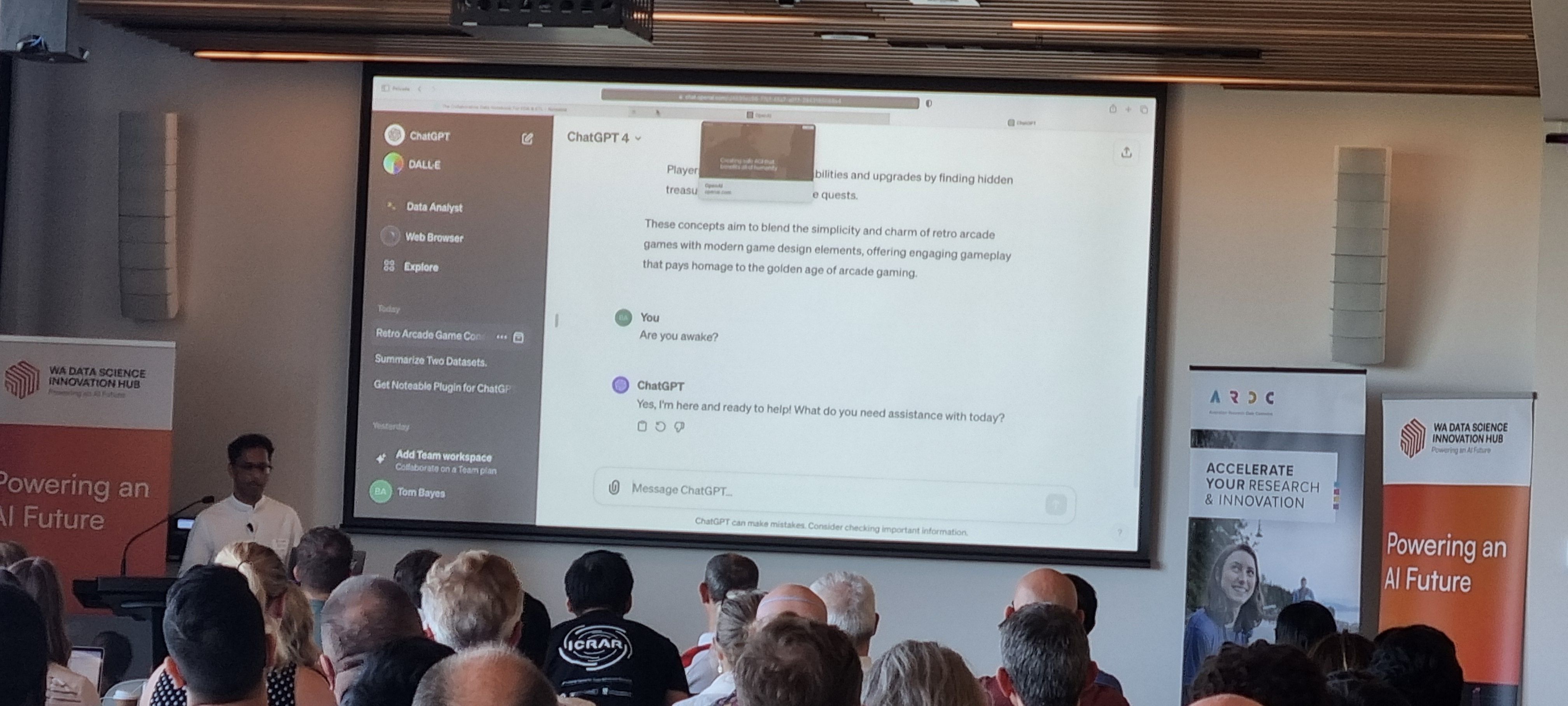 A/Director Aloke Phatak (and Alex Jenkins of WADSIH) demonstrated how to use ChatGPT for data analysis at the 2024 ResBaz. Aloke's live demonstration showed researchers how the data analysis module of ChatGPT 4.0 could be used to analyse data using natural language, bypassing programming in a computer language such as Python. Doing so allows researchers to focus on the questions that they want to ask of the data, without getting caught up in the details of a computer programming language.